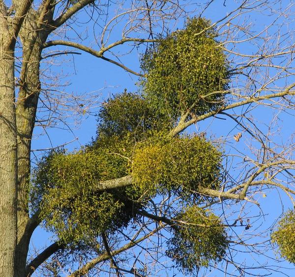 While mistletoe can grow on more than 100 different types of trees, it is most often found on pecan, hickory, oaks, red maple and black gum trees. Mistletoe is a small evergreen shrub that is semi-parasitic on other plants. Instead of producing roots in the ground, mistletoe sends out root like structures into tree branches, from which it steals water and nutrients. It is most easily seen in winter. Look for ball shaped green masses up to 3’ wide connected to other branches. For treatment of existing trees, it is important to remove mistletoe before it produces seed and spreads to other limbs or trees. Mechanical control through pruning tree branches is the most effective method for mistletoe removal.